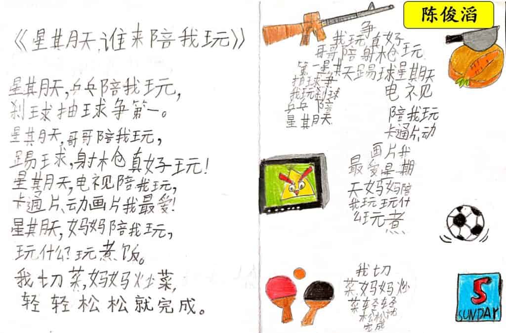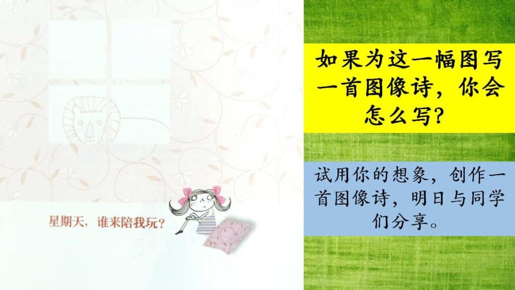 我先让小瓜们为《星期天,谁来陪我玩?》这一幅图写一首图像诗。在第二天,我才展示林世仁老师的这首诗,小瓜们都赞叹林老师太厉害了。在讨论小瓜们所写的图像诗,听着几位孩子分享的过程中,他们心中都期待:星期天,希望爸爸妈妈的陪伴。这时有位男生补充其中一位分享的女同学说的话说:“她好像很孤单。”我听了心里有点感慨。
