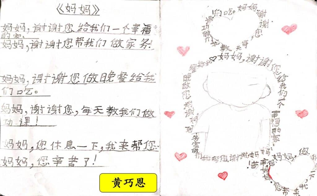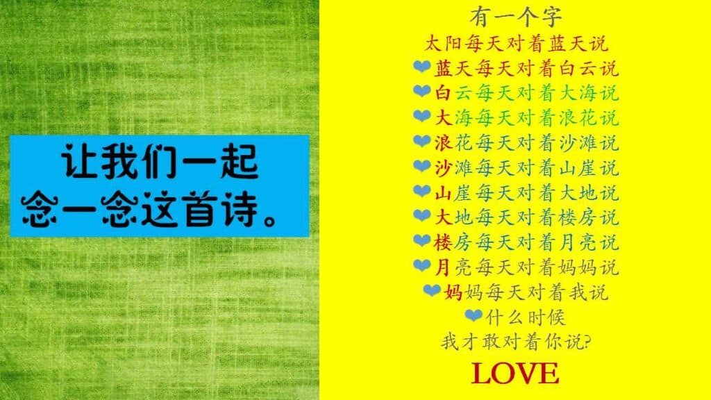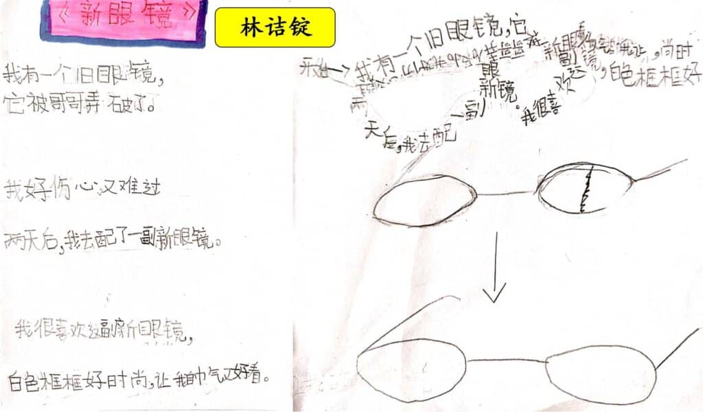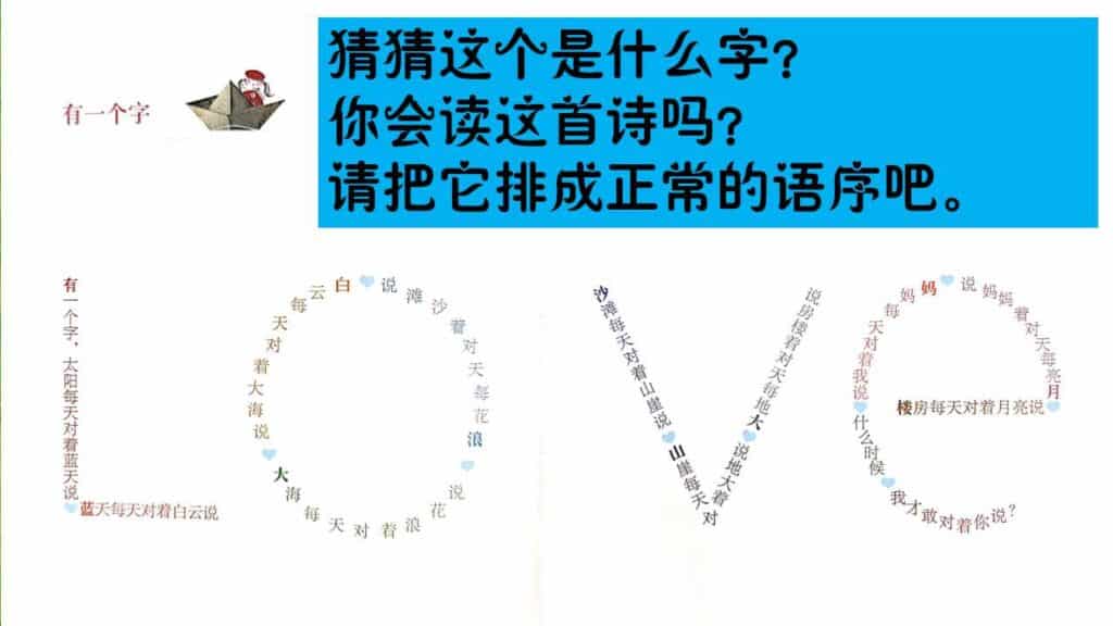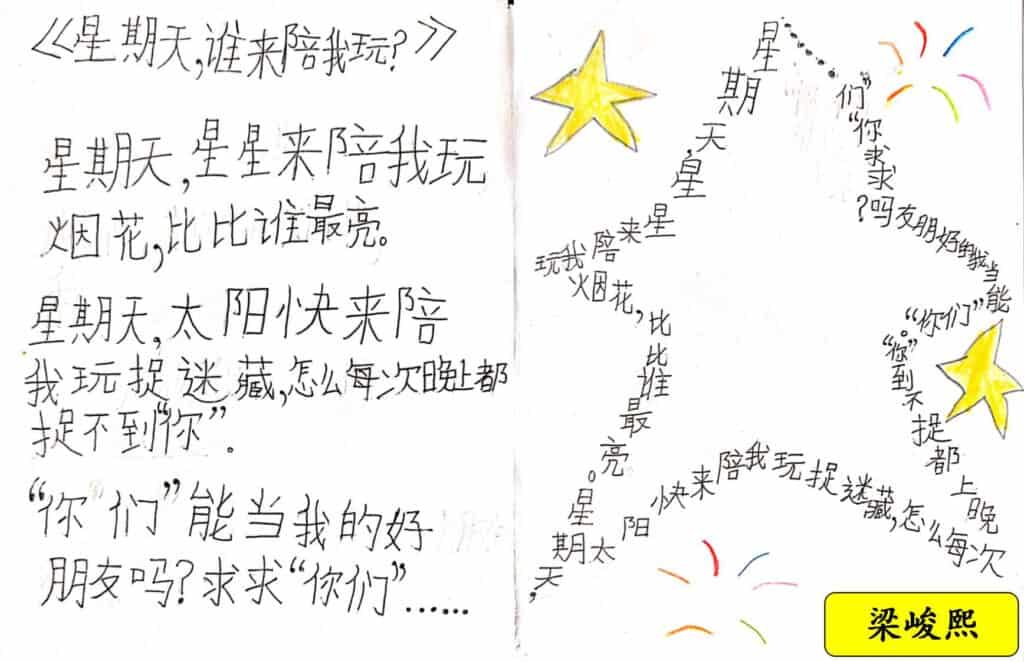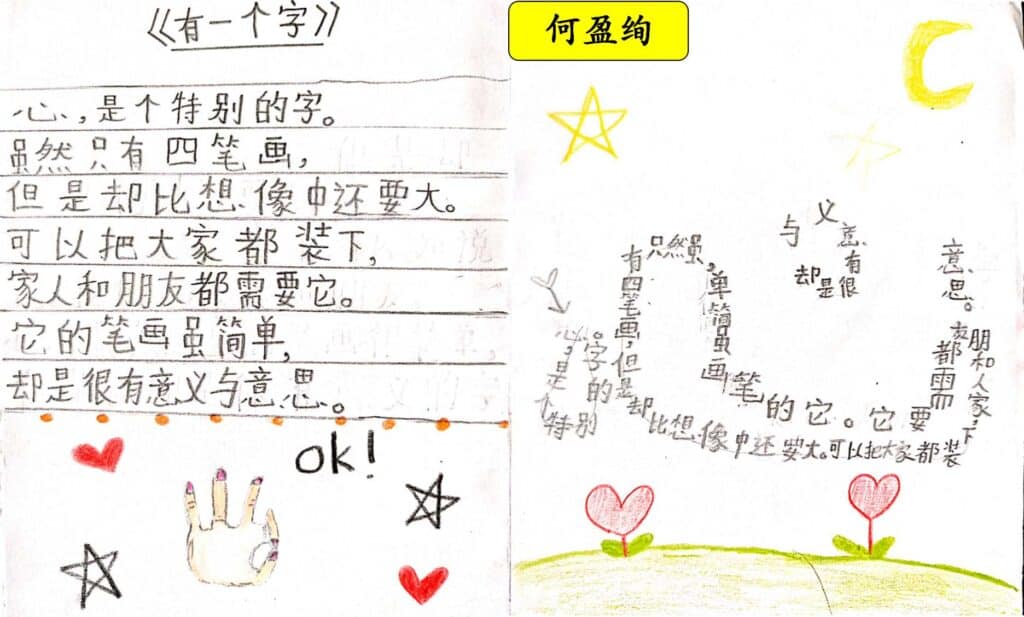 接下来,我分享了《有一个字》这首图像诗。然后,我让小瓜们猜猜这首诗是什么字。小瓜们很轻易地说出那是“LOVE 爱”,然后我就把这首诗排成正常的语序让孩子们感受这首诗的文字美。欣赏了那么棒的图像诗,我就让他们也来创作一首《有一个字》。起初,他们会有点混乱,思维还徘徊着之前知道他们把图像诗放入“容器”中。经过多番指导,我鼓励他们放胆地去写,自由地创作,然后重复我每次都说的:“我相信每个作品都有它的价值的。”