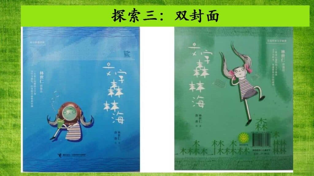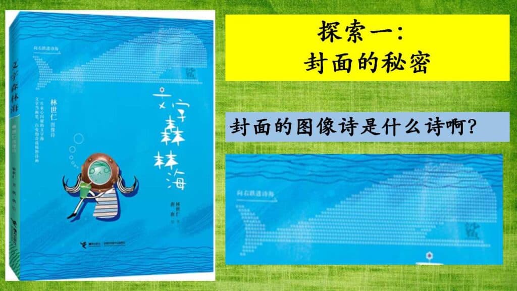然后,我就展示这本书的“双封面”:右翻面是“左边有座文字森林”;左翻面是“向右跌进诗海”。小瓜们对封面上的女生特别好奇,纷纷说出其特点。