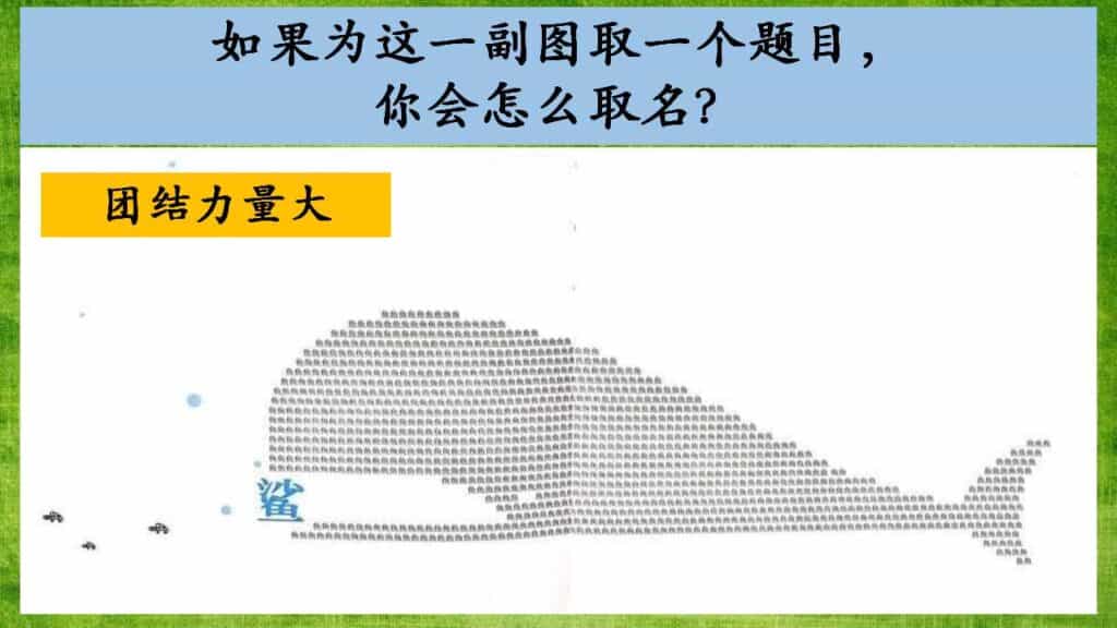 “老师,题目是《鲸鱼咬鲨》、《大鱼吃鲨鱼》…….”经过一番引导后,小瓜们仍然局限于眼前看到的大鱼,未能看出这首图像诗的含义。我只好揭晓题目,看到小瓜们“哦”的反应,他们也议论纷纷,终于明白“团结就是力量”。