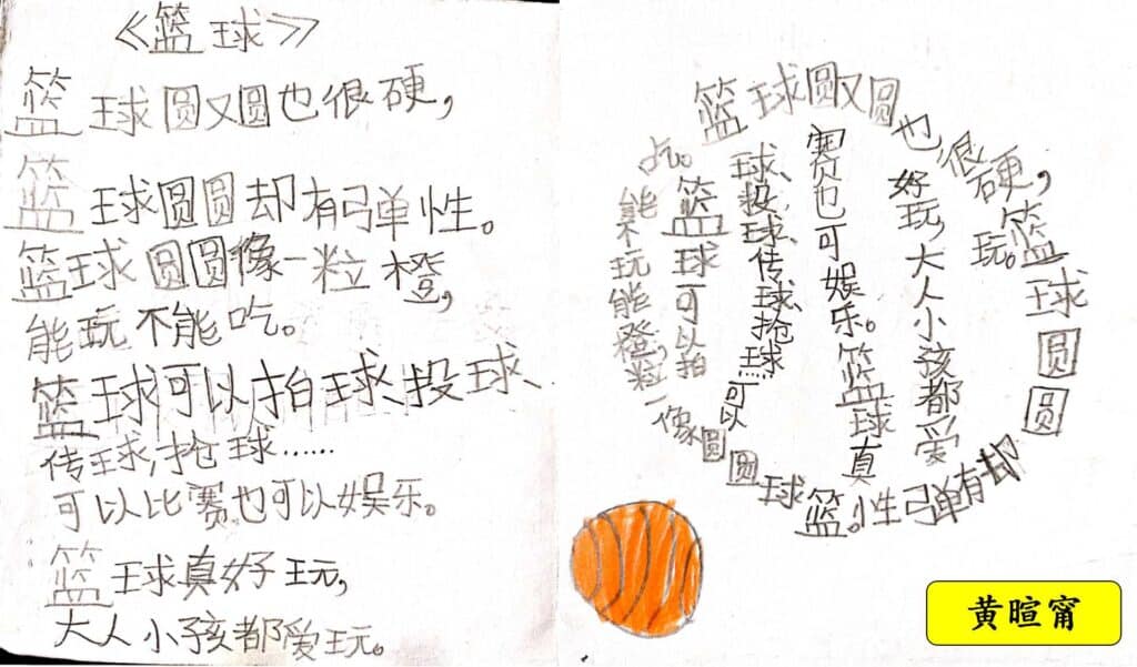 一开始介绍图像诗时,,小瓜们都对图像诗感到好奇,但还不能掌握图像诗的特点,操作也不是很好。在让他们开始创作前,我先思考一番。我让先让小瓜们写好诗歌,然后才把诗歌让入图像诗这个“容器”之中。但是,经过几次的创作过程,我总是被图像诗的理论框住了孩子们的创作。