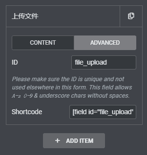 1. Forms 里文件上传 Item,点击Advanced,把ID 换成 ‘file_upload’
