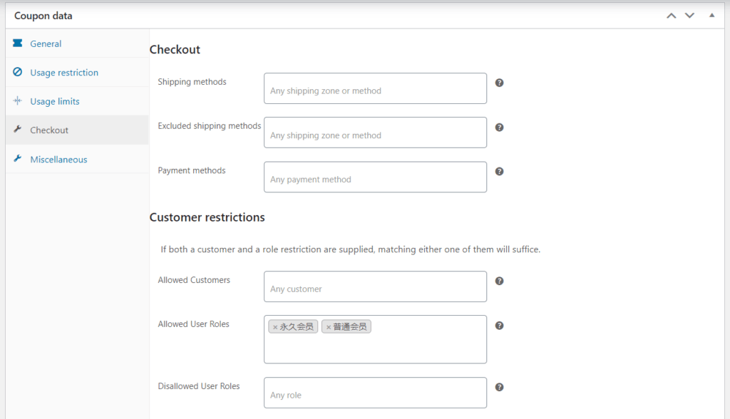 Allowed User Roles: 永久会员 & 普通会员【限制这 coupon 只能被会员使用】