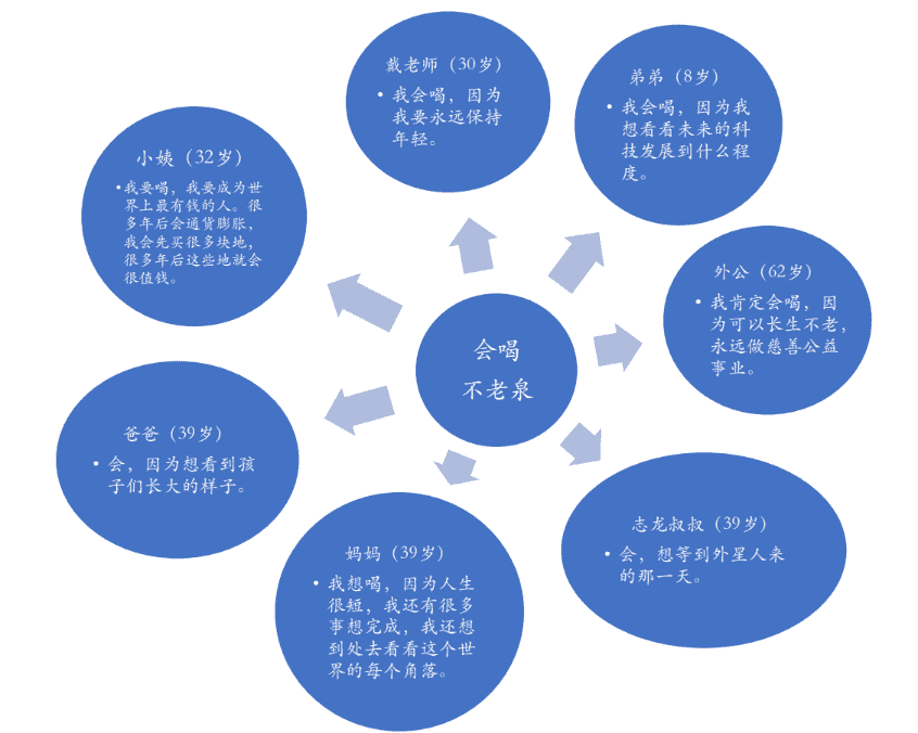 3. 不老泉,喝不喝 | “如果这世界上有不老泉,你会喝下吗?为什么?请说明原因。”试根据上述问题,采访身边的亲戚、老师、同学、朋友,然后用适当的图表与文字说明采访结果。