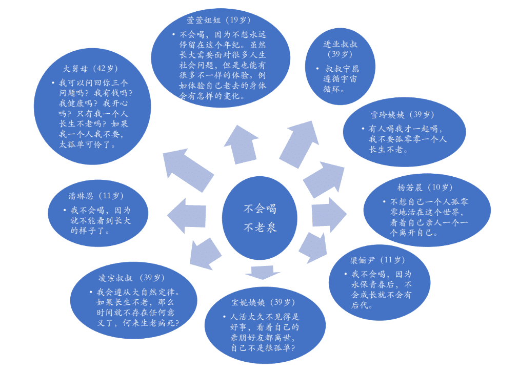⼤部分选择不喝不老泉的⼈,他们给的理由是不想孤零零⼀个⼈存活在这个世界上,不想眼睁睁看着自⼰的亲友们离 世。我觉得这个理由很合理,因为⼈与⼈之间是有感情的。眼睁睁看着亲友们⼀个个离去,⼼里⼀定非常难受。⼤舅母问回 我:“我有钱吗?我健康吗?我开⼼吗?我⼀个⼈吗?” 。这些问题让我反思了,如果⼈没有以上这些条件,那存活下来并没有什么意义。没有钱、没有健康、没有开⼼和没有亲⼈朋友的⼈⽣是非常悲惨的。我的同学潘琳恩想看到自⼰长⼤的样⼦,我觉得她现在还小,所以认为自⼰长⼤后应该会有很⼤的变化。我另⼀个同学梁俪尹说她想要后代,笑死我了!我现在才知道俪尹那么渴望繁殖后代。进业叔叔和凌宗叔叔说要遵循宇宙循环和⼤自然定律,这个道理很深奥,我有点不明白,或许等我长⼤ 后,我才会明白这个道理。萱萱姐姐说想体验不⼀样的东西,我猜想她想要体验在每个年龄阶段能做些什么吧!