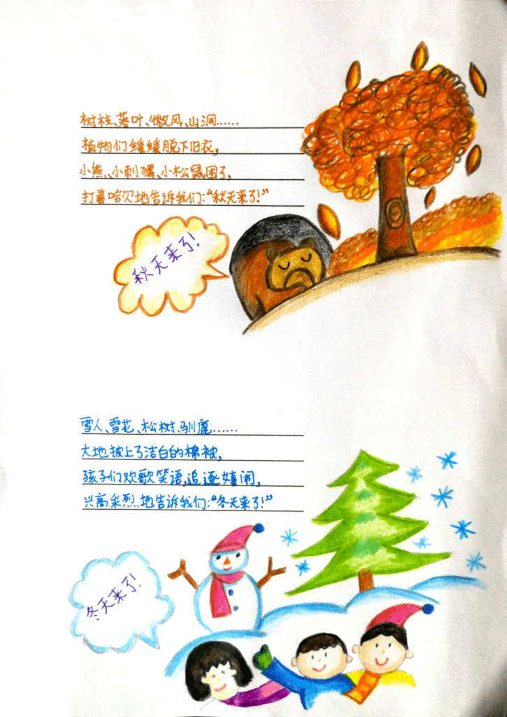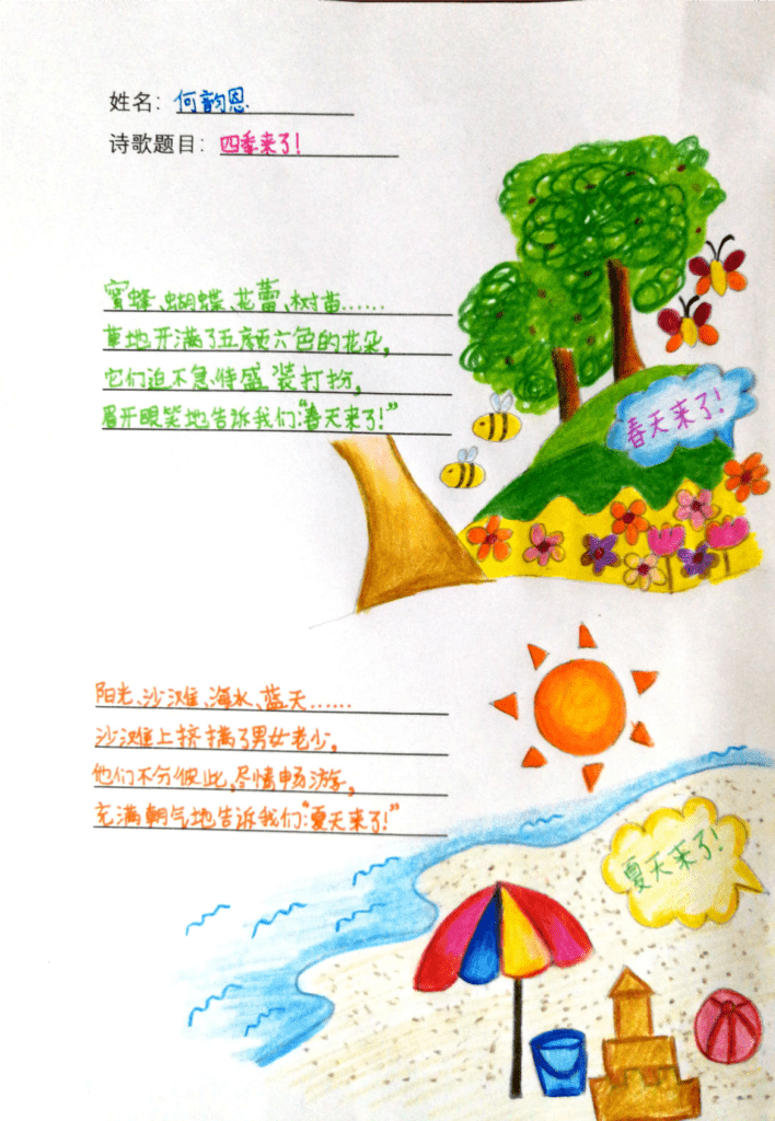 韵恩的投稿作品插图精美,色彩鲜艳。诗中用了不同的意象带出了春、夏、秋、冬,四季,是一个很棒的大自然的观察者。