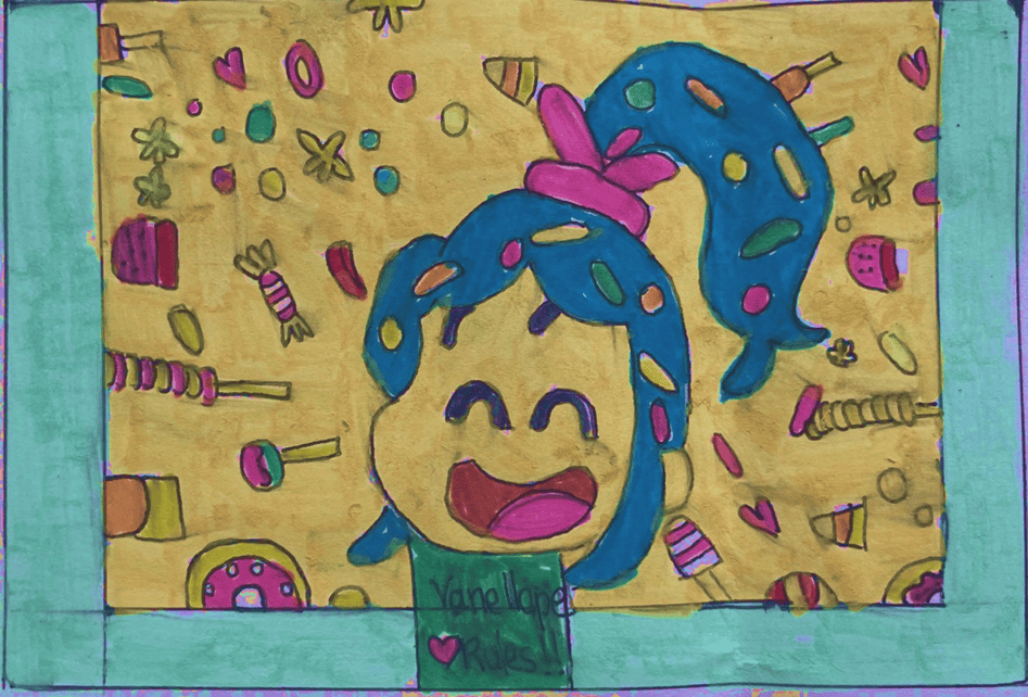 钱包上面, 有一个扎着马尾的小女孩,小女孩的四周围绕着数不尽的糖果,甜甜圈……