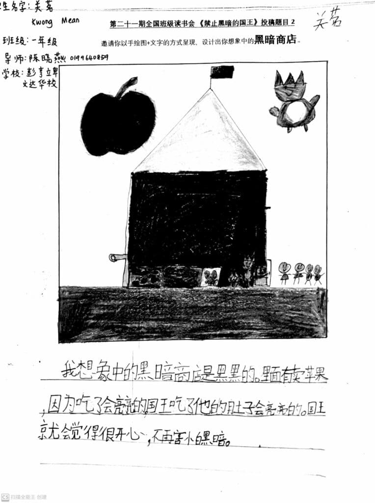 黑黑的商店,里面卖的竟然是吃了肚子会发光的苹果,这样的想法着实有趣。关茗在作品中提到国王吃了这个苹果后肚子会亮亮的,不再害怕黑暗,这个想法是故事的延伸,是理解文本后才能写出来的。加油!