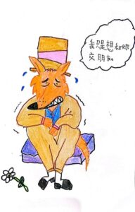 恭喜玮骏。色彩鲜明的图片、狐狸脸上的细节,成功吸引读者的目光;地上那朵掉落的、无色的花朵更衬托出狐狸心里的无奈。唯文字里的逻辑,略显怪异。前面的部分表示狐狸是真心想与鹅妈妈结交朋友,后半段却写了“最后也被你骗了”。这个“也”用得不妥,改为“却”字,逻辑和句子都会更加顺畅。