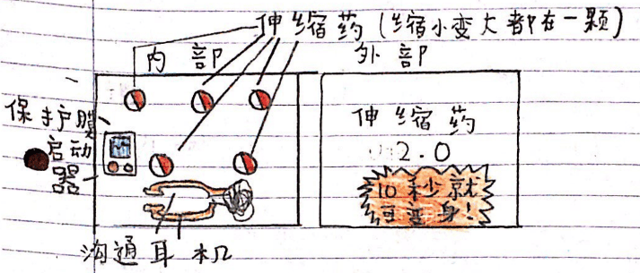 最后,我有一些改进建议想要与您分享。第一,我建议在使用者缩小后有一层保护膜,以防止被他人踩扁。第二,我觉得可以附送一对耳机,这样的话我们一样可以和同伴取得联络。第三,我希望缩小和变大的时间可以从 45秒到减少10 秒,这样可以让使用者及时变身。第四, 由于药水和饼干容易弄丢, 我觉得可以让药水和饼干融成一体, 并设计一个按钮操控,使它不容易弄丢。最后,我希望变身次数可以增加, 那么使用者就可以减少少服用的次数。这可以减少药水和饼干的掉落或不见。
