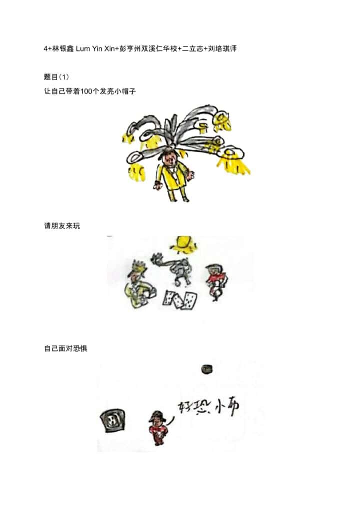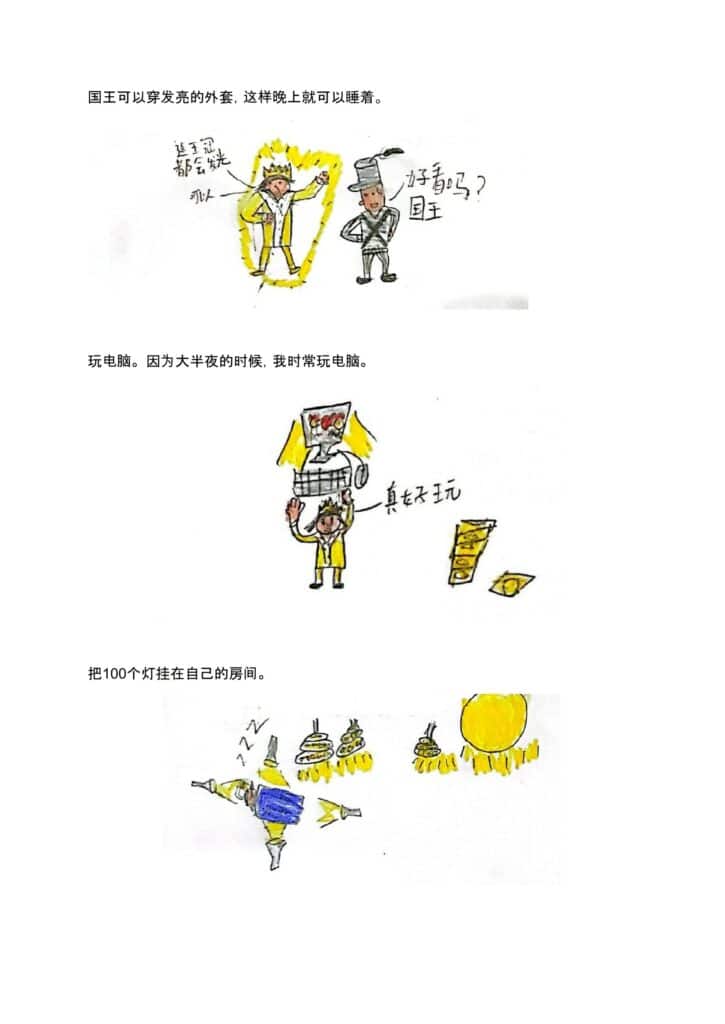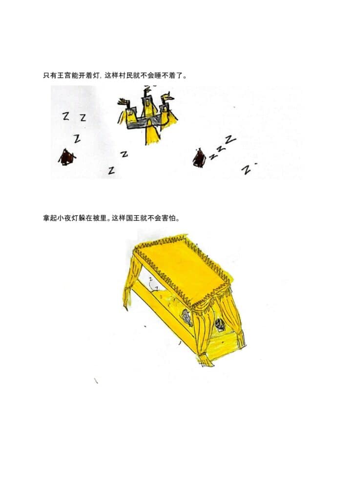 银鑫的点子真多,一下子便能给国王8个建议。银鑫所给的众多建议中,5个与“灯光”有关,这顺应了故事的逻辑,也与故事的结局有异曲同工之妙。另外2个建议与“生活经验/心理层面”有关,银鑫把自身的生活经验与故事做连结,这也是阅读力的一种表现。针对“自己面对恐惧”这个建议,评审老师认为银鑫可以写得详细一点,那么读者更加容易明白银鑫想表达的想法。