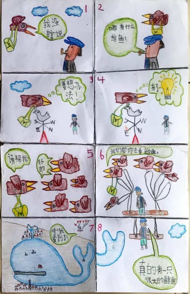 看到子轩的细腻,候鸟的书包、渔夫船长的烟斗……感受到子轩的用心,用了8格图并附上顺序号码。欣赏你的创意,让候鸟叫上伙伴,带着船长一探究竟!这是很难得的具想象力作品,内容生动且能用简单构图带出故事。