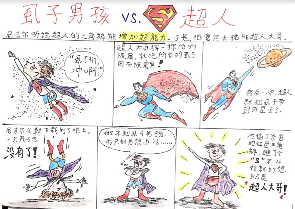喜欢廷燊的画,不管是字体的大小、图文的位置、色彩的使用,都画得非常非常用心。如果故事能更曲折一些,让虱子男孩和超人的对决再多增加几个回合,那会更有变化,也更精彩。