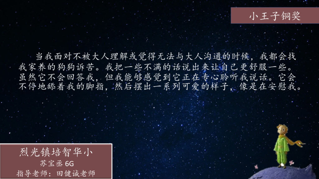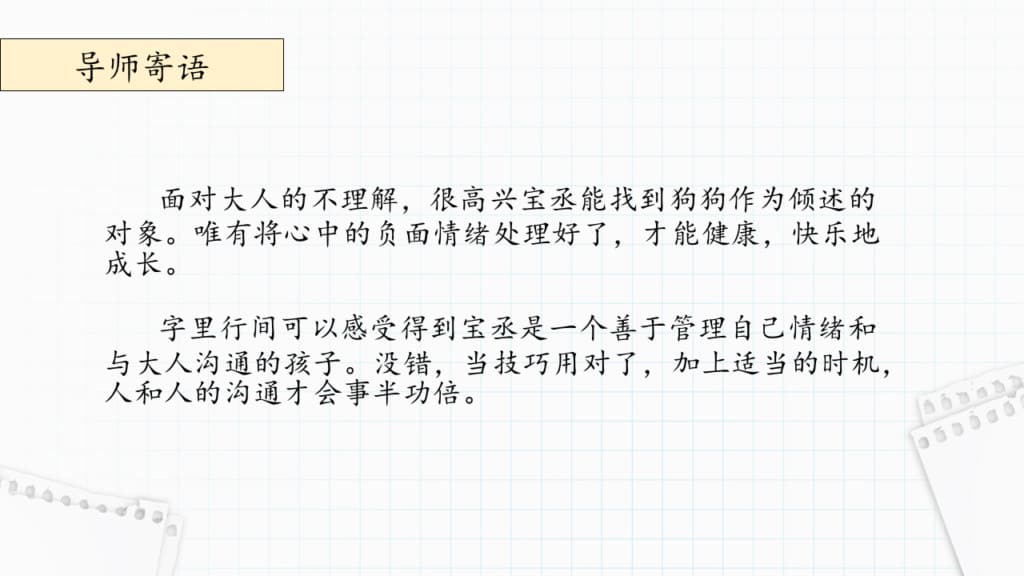 当我面对不被大人理解或觉得无法与大人沟通的时候,我都会找我家养的狗狗诉苦。我把一些不满的话说出来让自己更舒服一些。虽然它不会回答我,但我能够感觉到它正在专心聆听我说话。它会不停地舔着我的脚指,然后摆出一系列可爱的样子,像是在安慰我。