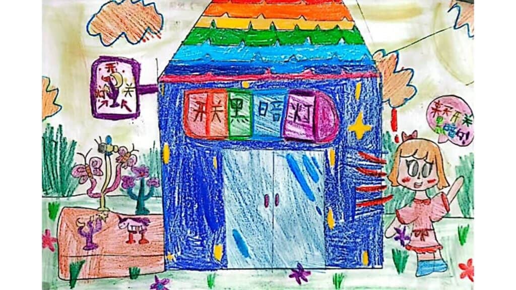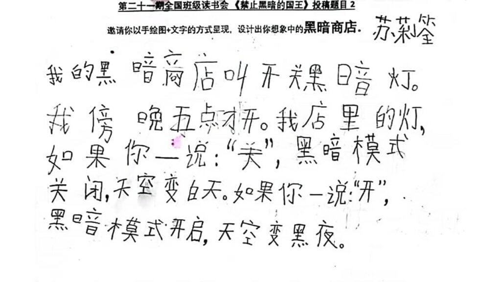 打开黑暗灯天空会变暗;关闭黑暗灯天空反而变亮了,莉筌的“黑暗灯”点子颇为新颖,也契合“黑暗商店”的主题。可爱的手绘图、鲜艳的颜色也成为了作品的闪光点之一。要是莉筌能够多书写或绘画有关“黑暗商店的商品”之细节,那就更加棒了!