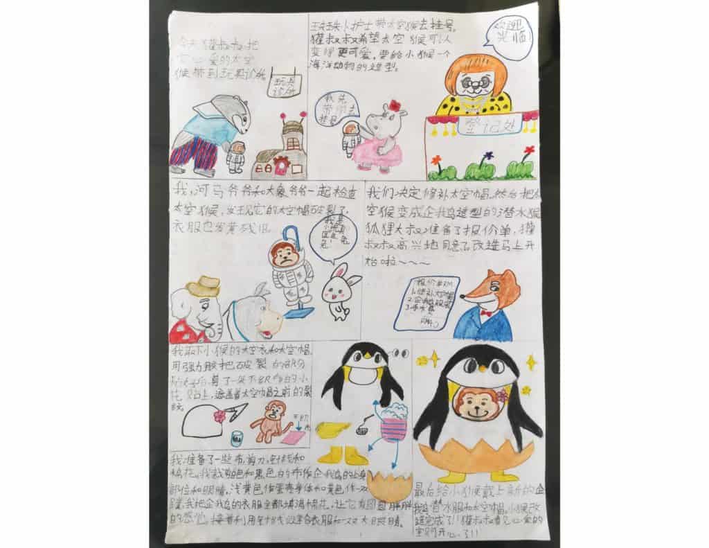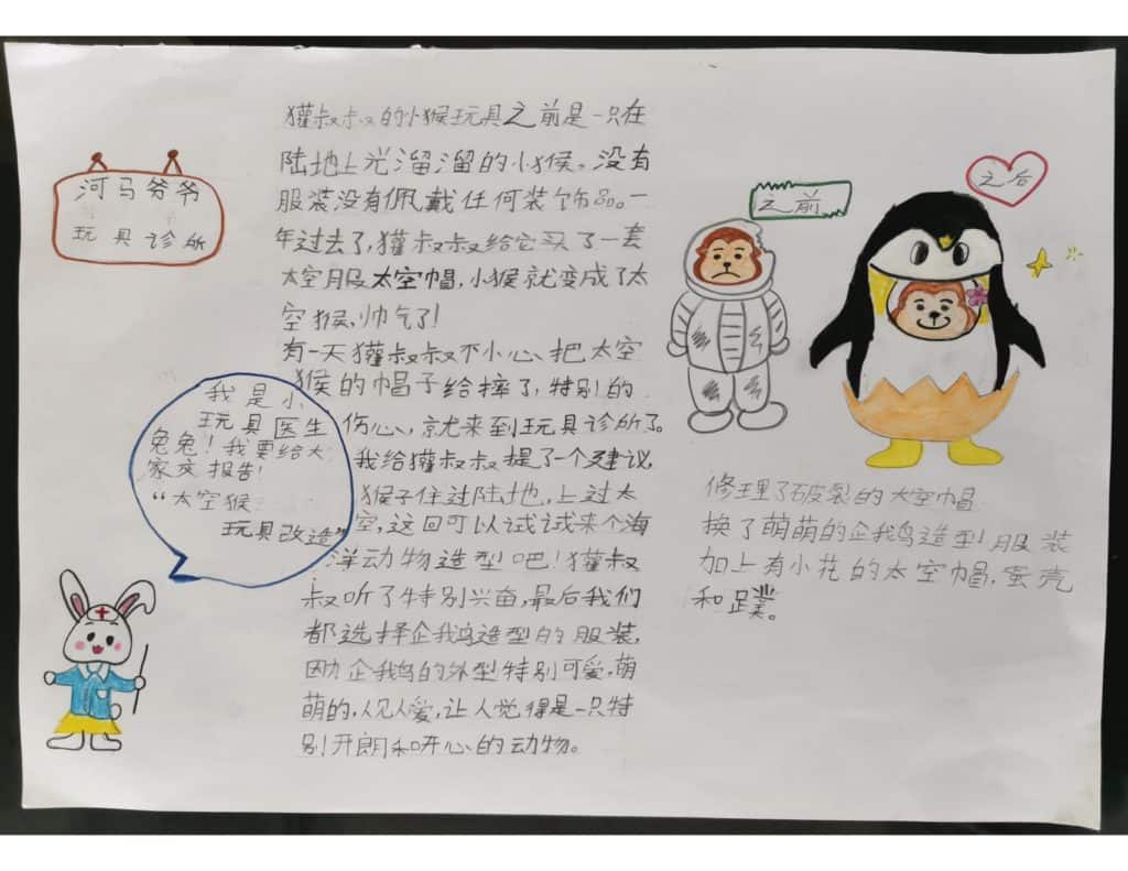 天渝的作品完整且细腻, 有连环图解释修理玩具的经过, 还有“太空猴玩具改造”报告书! 我通过天渝的文字陈述, 觉得天渝非常有想法! 想像太空猴没去过海洋, 在改造过程中,让它穿上企鹅装, 便能在海洋里遨游。 我也看到天渝在画图中, 设计了—位小玩具医生兔兔, 仿佛自己化身到故事情节里, 与故事中的角色互动着。 这样的投入,难能可贵啊~