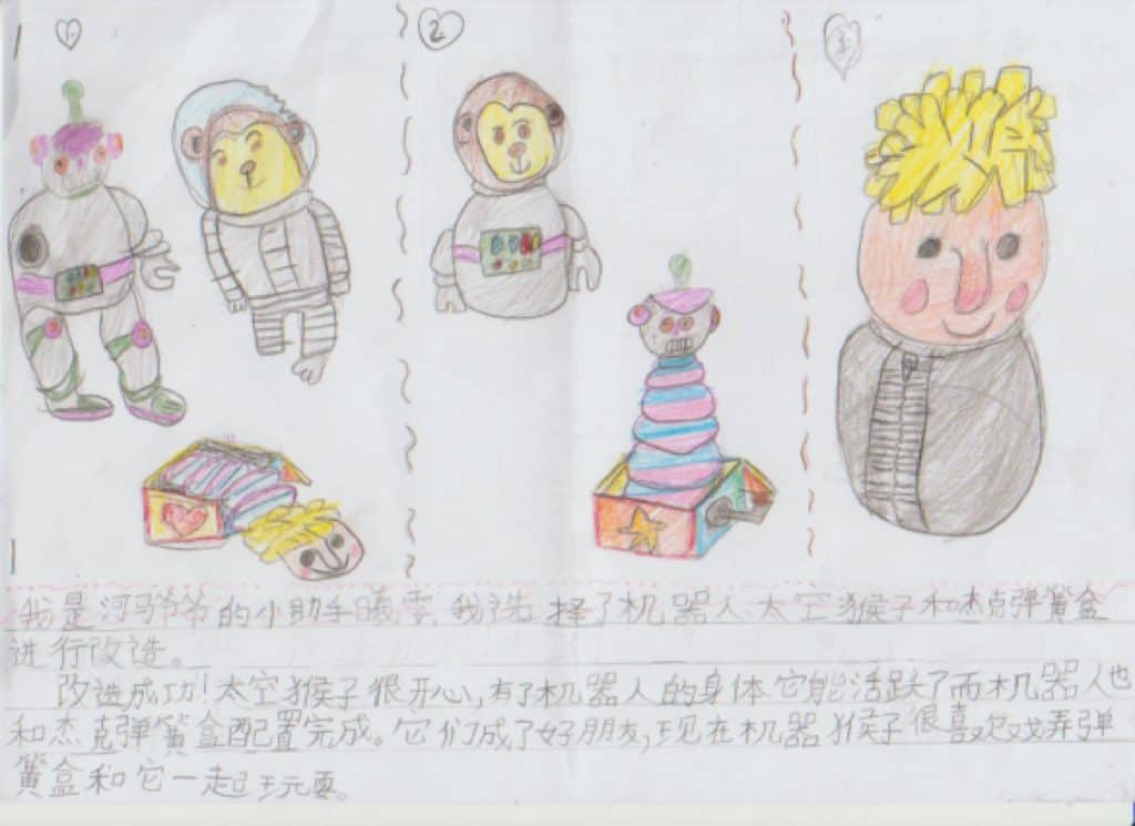 动脑筋,让坏掉的玩具,有新的形象、新的玩意。