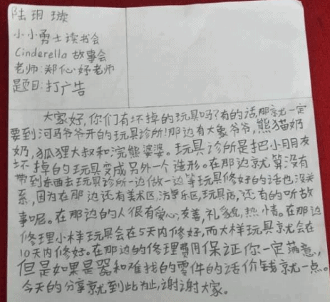 玥璇很用心,很仔细地为大家介绍玩具诊所呢!从玩具医生,到诊所里的各个部门,玥璇都说得很仔细,而且玥璇还告诉大家诊所里的每一位都很有爱心,很友善,很有礼貌,很热情呢!听了玥璇的介绍,我都很想快点去玩具诊所那里呢!而且,最重要的是诊所的修理费用保证让大家满意呢!这样的玩具诊所肯定会吸引很多顾客呢!