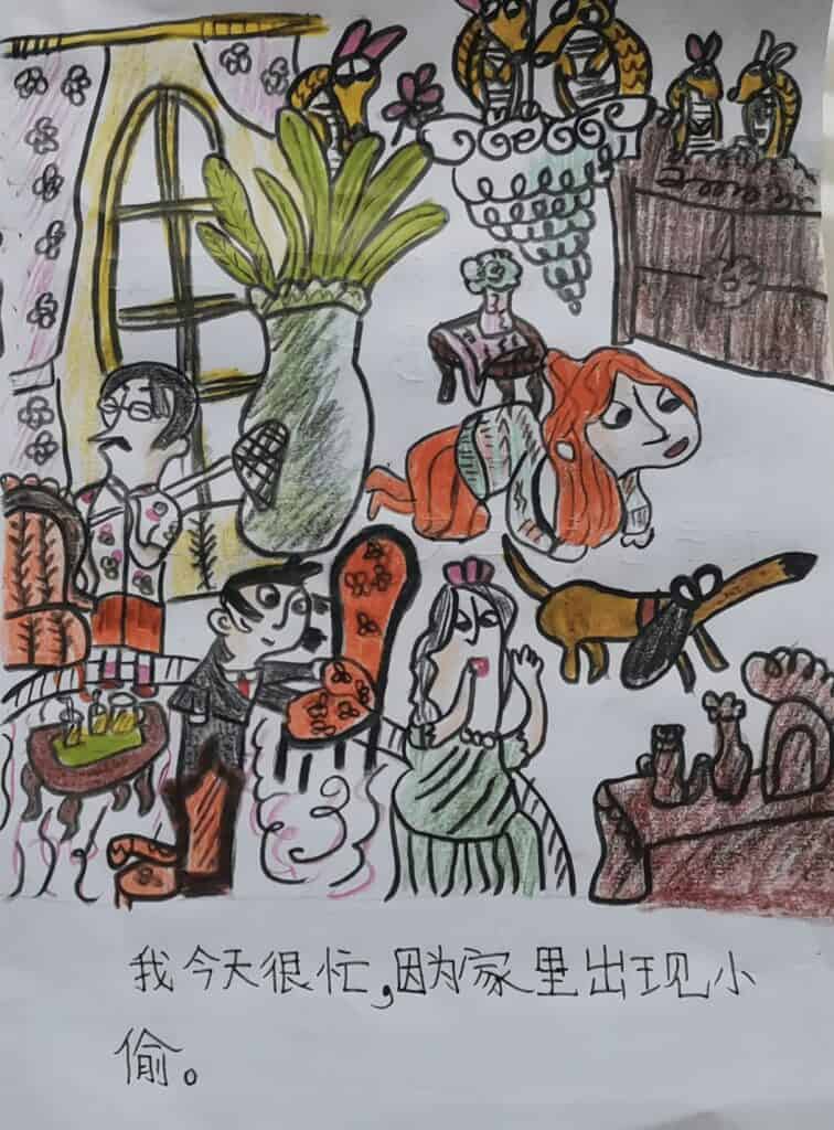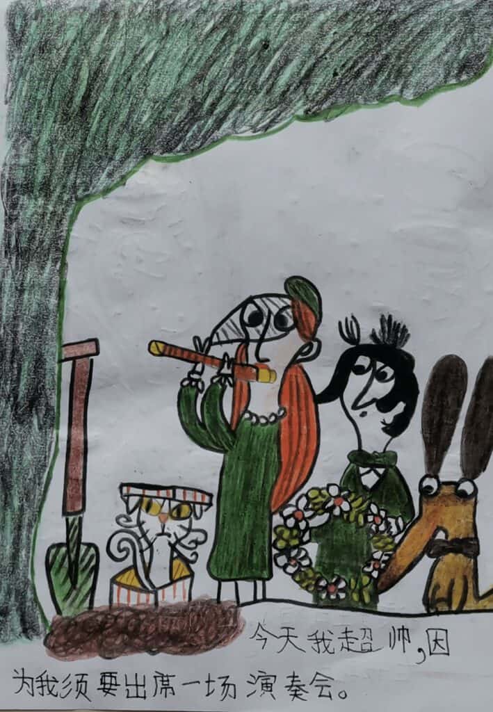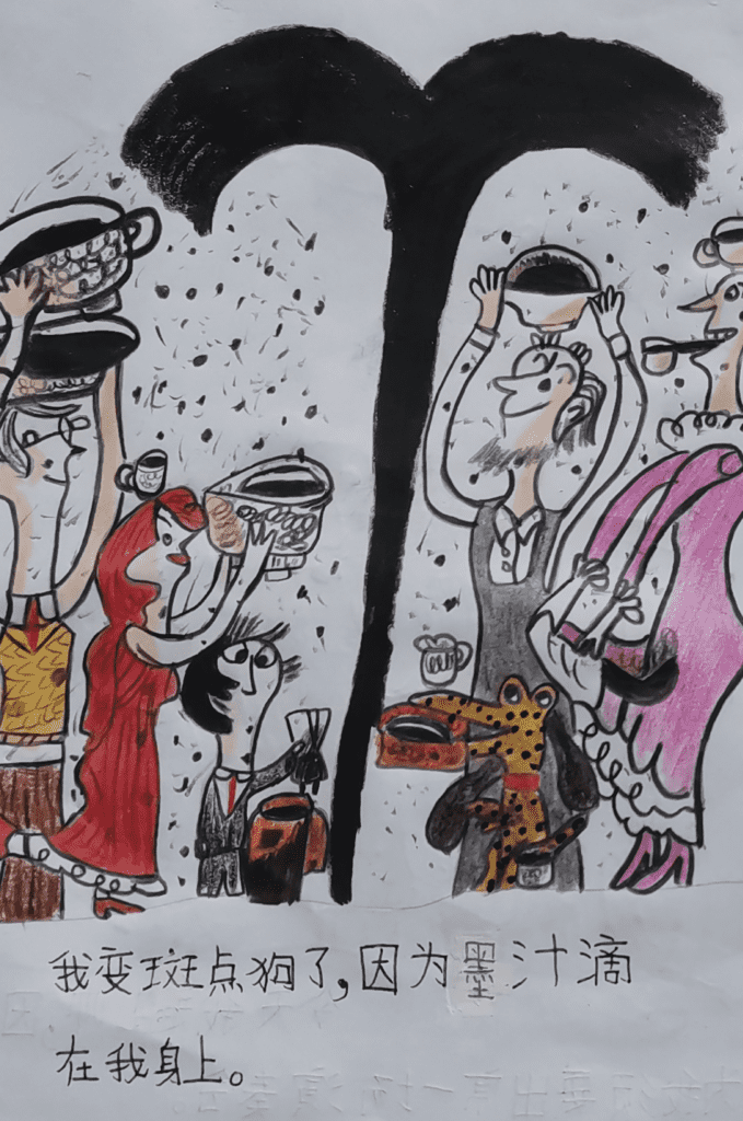 紫圻画的小狗很可爱,内心独白也好逗趣呢!小狗把小猫的“葬礼”当作是演奏会,想必是因为听见笛子的音乐声吧?墨汁滴在小狗身上,变成斑点狗,真是贴切啊!邻居家的犰狳不见了,小狗却以为是要抓小偷,也跟着忙碌起来了,嘻嘻!