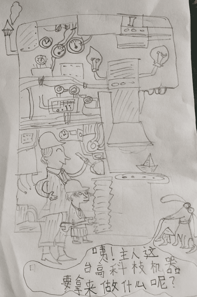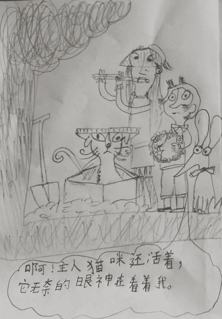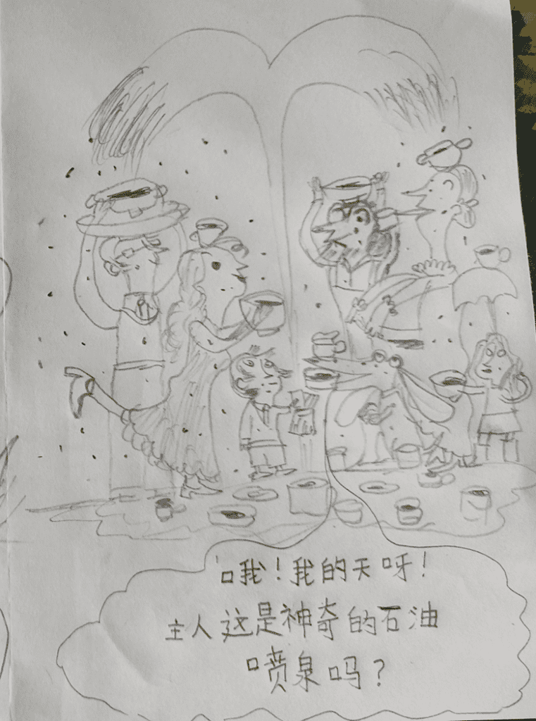 楗峰画的小狗特别爱主人,内心戏极其丰富,每一句内心对白仿佛都在与主人对话。小狗看到那台高科技机器时,充满着疑问的表情和语句,表现了对其用途的好奇;另外,小狗在参加猫咪葬礼时,想告诉主人猫咪还没死的急切:“猫咪没有死啊!它在用眼睛看着我呢!”好奇小狗还逗趣地把难堪的遭遇想象成好玩的喷泉——神奇的石油喷泉!太可爱了啦!