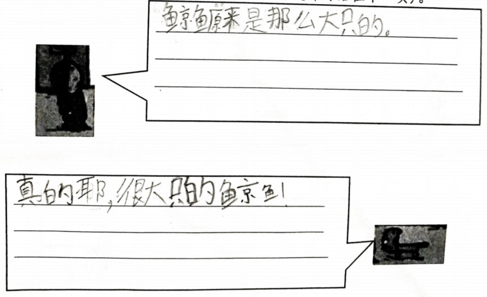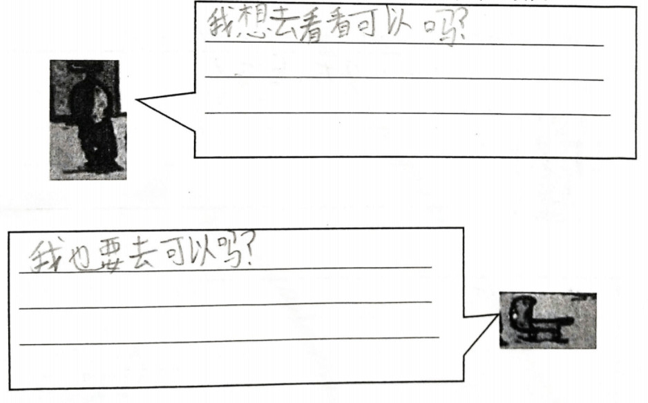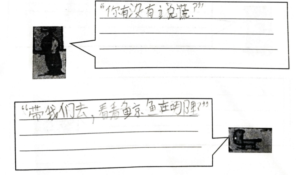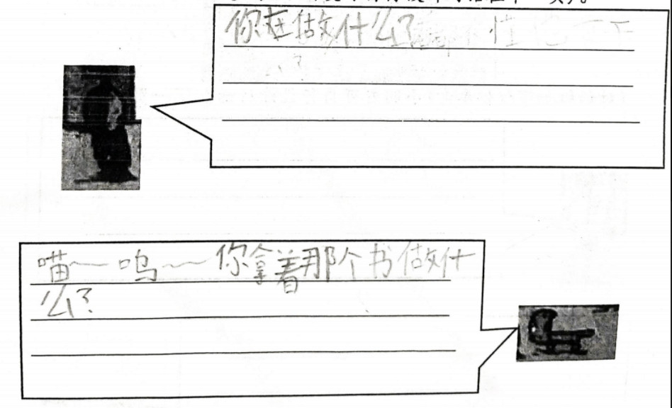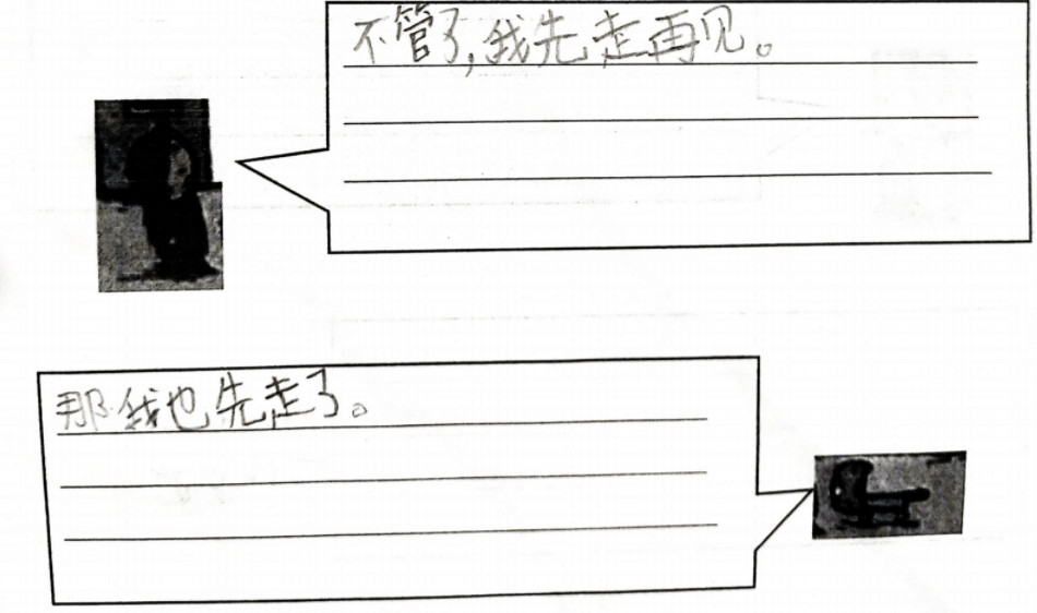 请你发挥想象力,把他们在整个过程中的对话写出来。建议你仔细观察以下页数,再把对话写出。