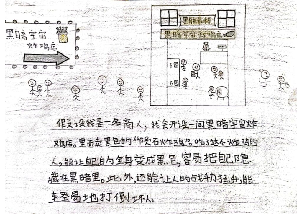 假设我是一名商人,我会开设一间黑暗宇宙炸鸡店。里面卖黑色的“陨石炸鸡”。吃了这个炸鸡的人,能让自己的全身变成黑色,容易把自己隐藏在黑暗里。此外,还能让人的战斗力猛升,能轻易地打到坏人。